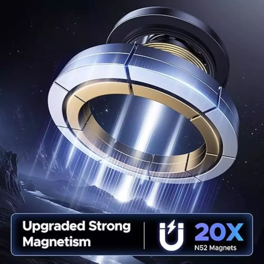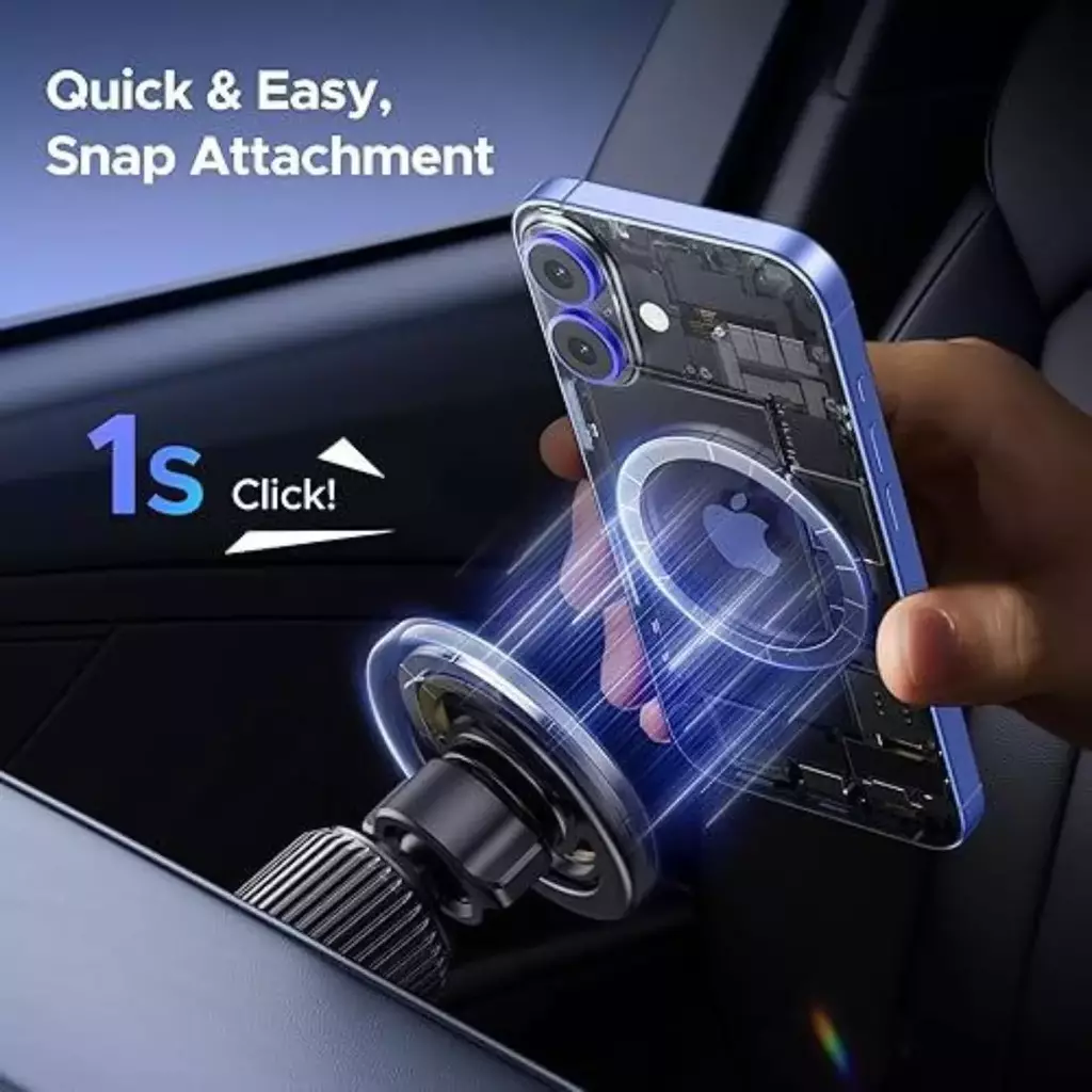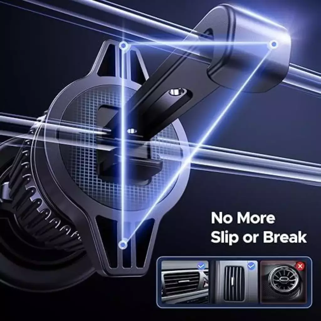 El soporte magnético UGREEN para celular se fija firmemente a la rejilla del auto con un clip metálico de triple agarre y 4 imanes N52, rotación 360 ° y protección de silicona, todo sin obstruir el flujo de aire.